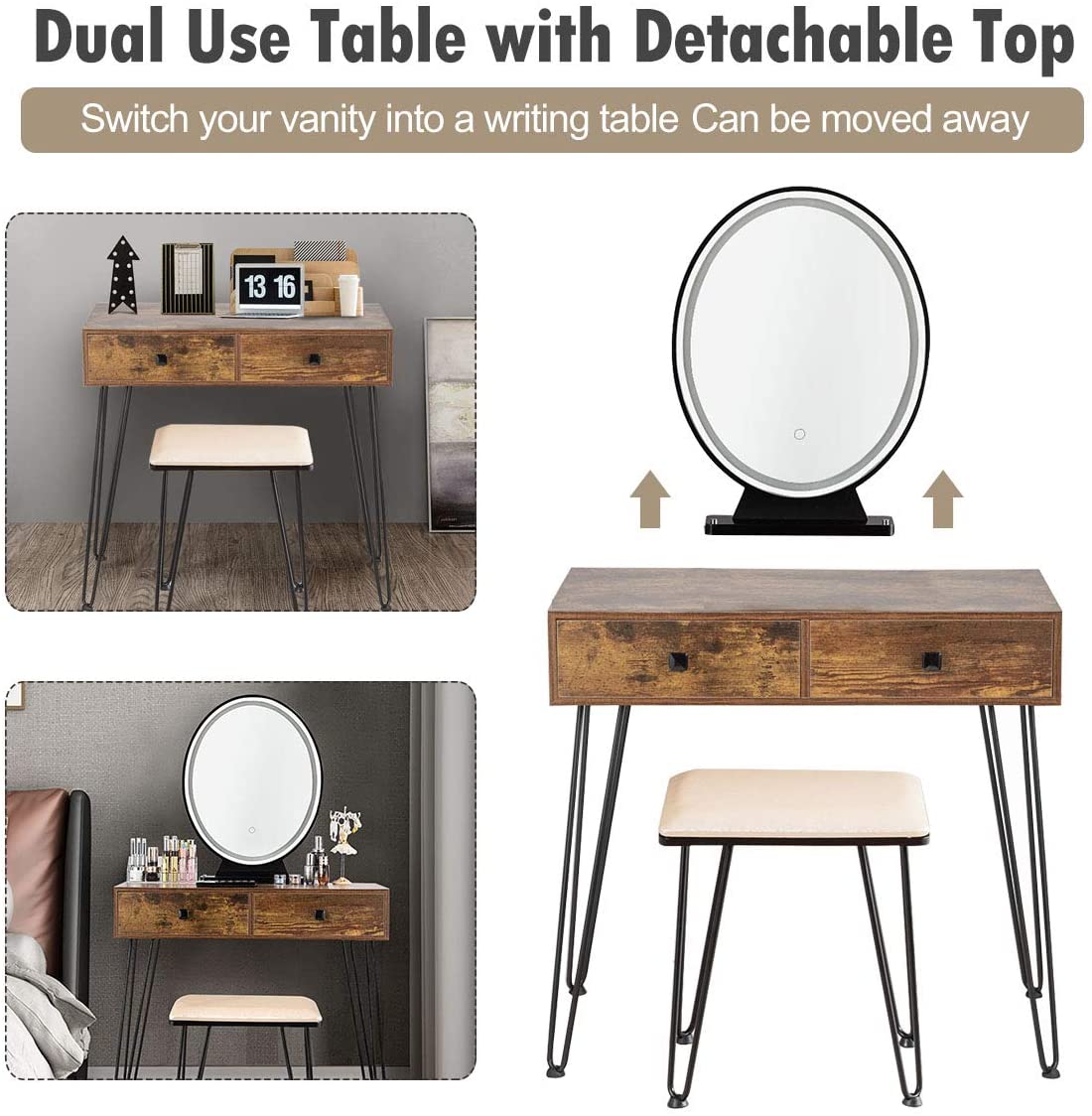 【Rustic & Multifunctional Design】Retro and concise appearance makes the vanity set more attractive and easy to match other furniture in home. And the mirror is detachable, which means this vanity table also can be used for writing or reading.